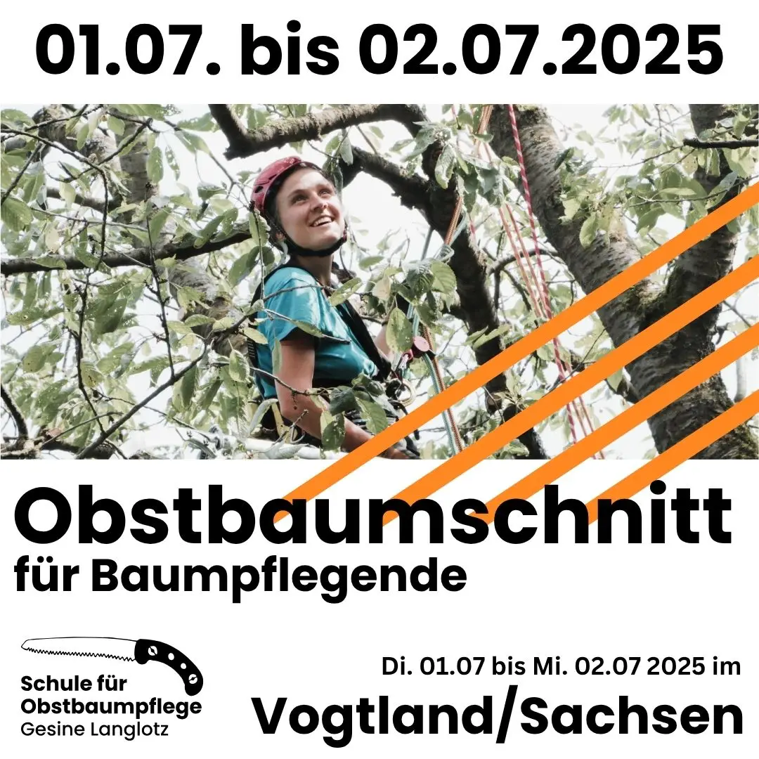 Juli 1 Di. 1. Juli um 9:00 - Mi. 2. Juli um 16:30 Sommerkurs: Obstbaumpflege für Baumpflegende Intensivkurs Sommerschnitt Schöneck im Vogtland Am Heim 3, Schöneck/Vogtland Veranstaltung Details Get Directions